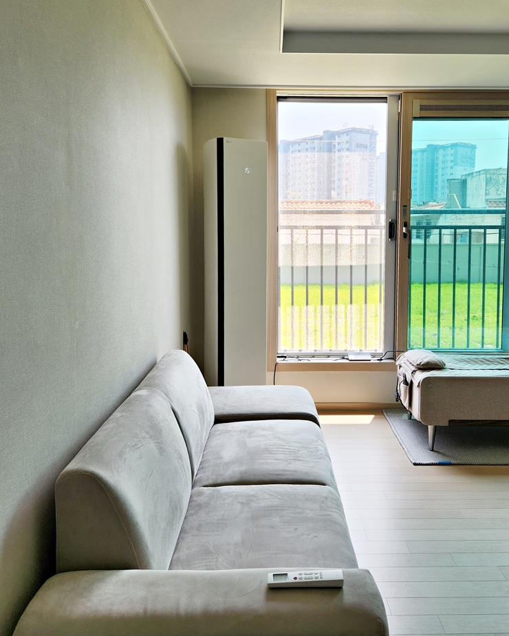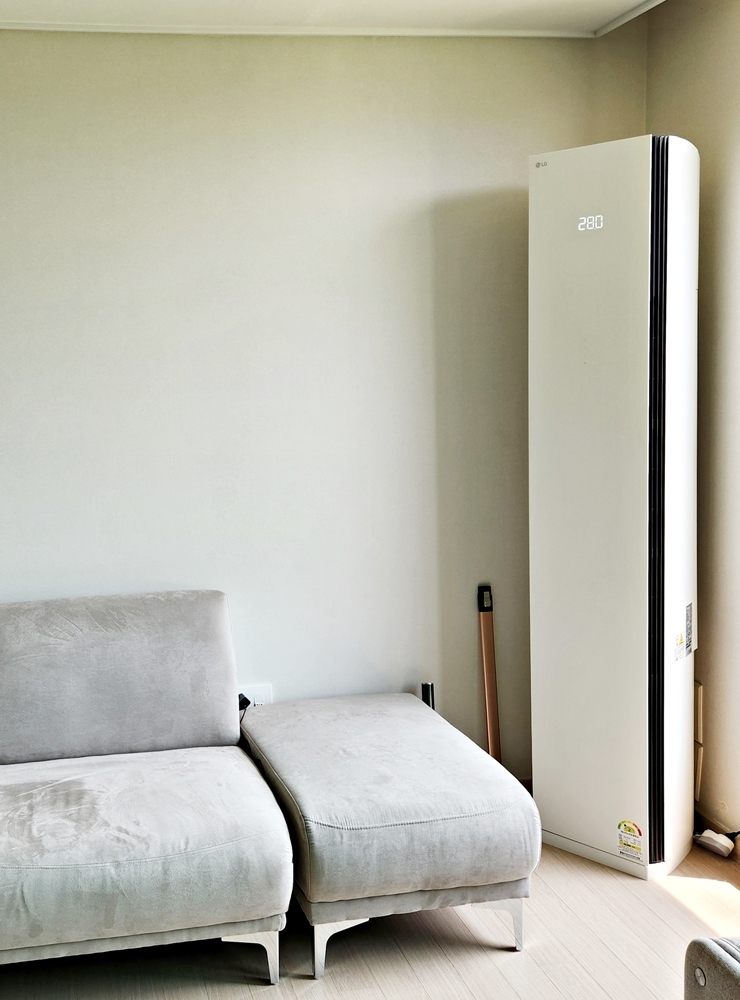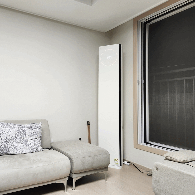 신축 아파트에 입주하면서 시스템에어컨을 설치하려 했지만, 잔금 납부 전까지는 공사를 진행할 수 없다는 말을 듣고는, 차선책으로 LG의 사계절 에어컨을 구매했다.