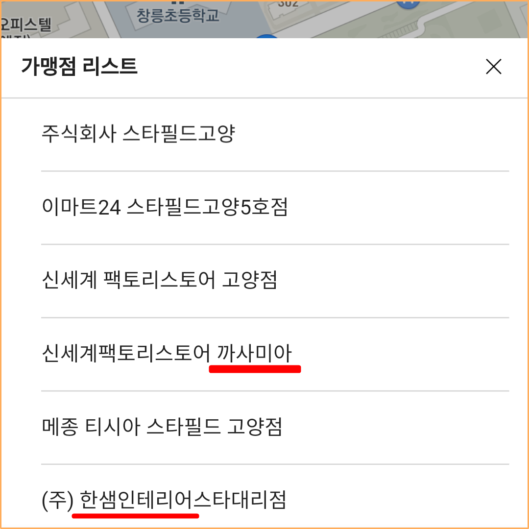 이번에는 스타필드를 조회해 봤어요. 고양점의 경우, 까사미아 가구점과 한샘인테리어 업체가 검색되네요.
