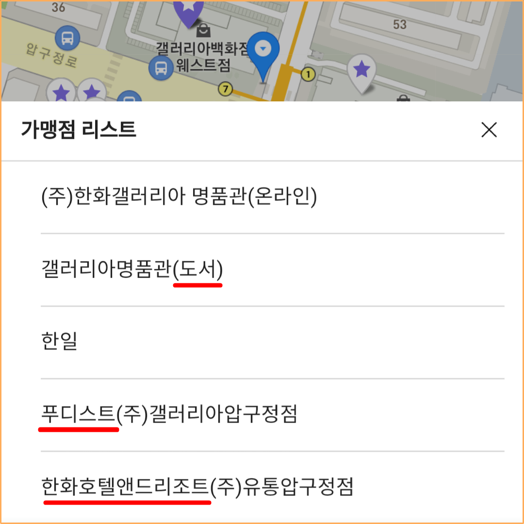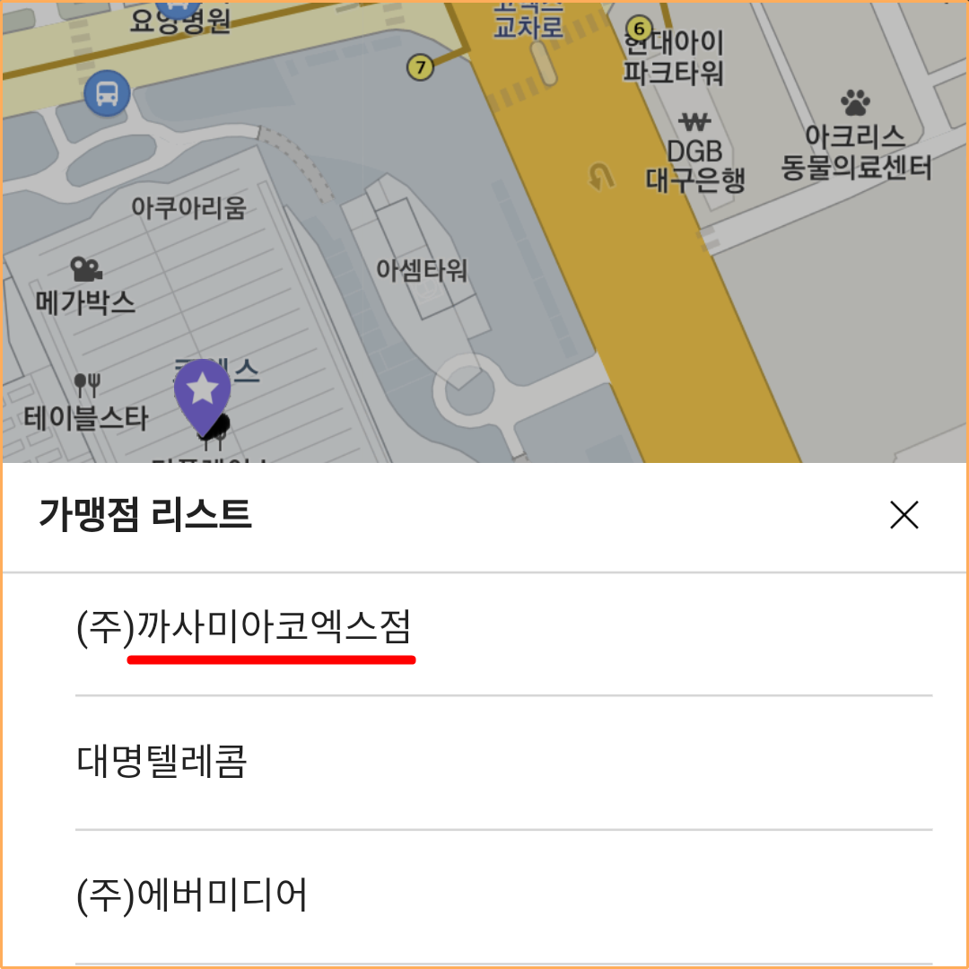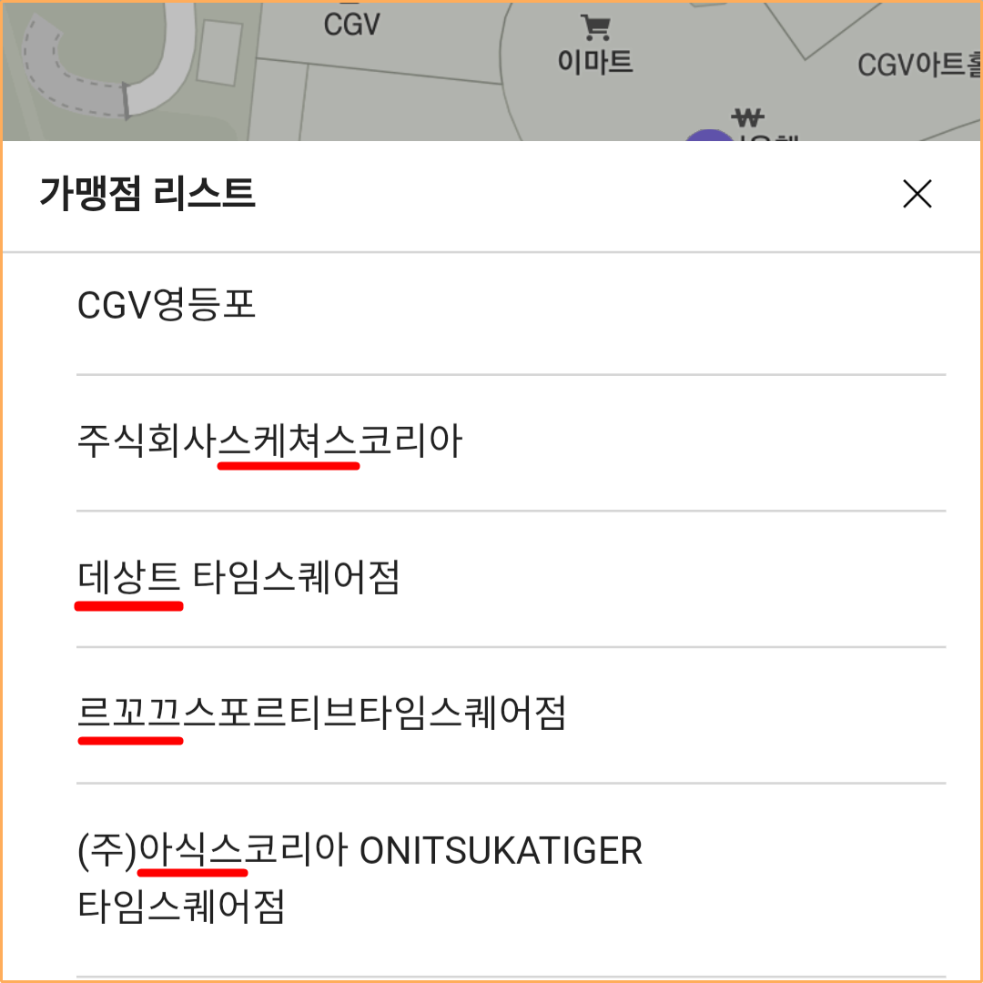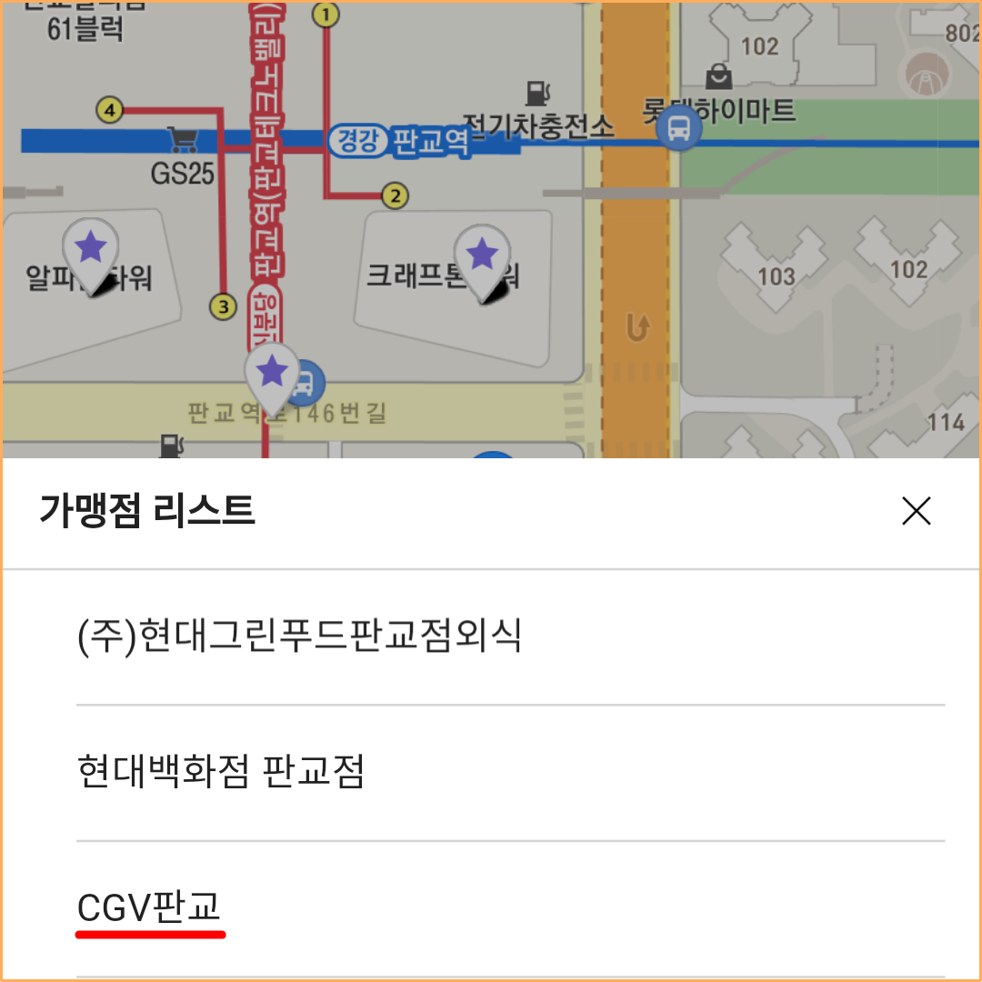 판교 현대백화점에 있는 CGV판교가 가맹점 리스트에 뜨죠?