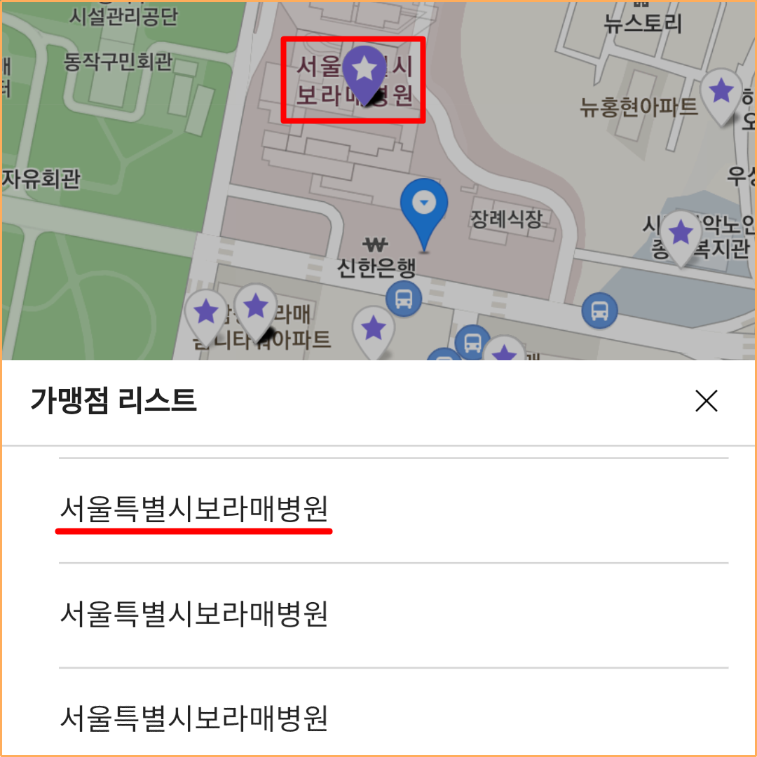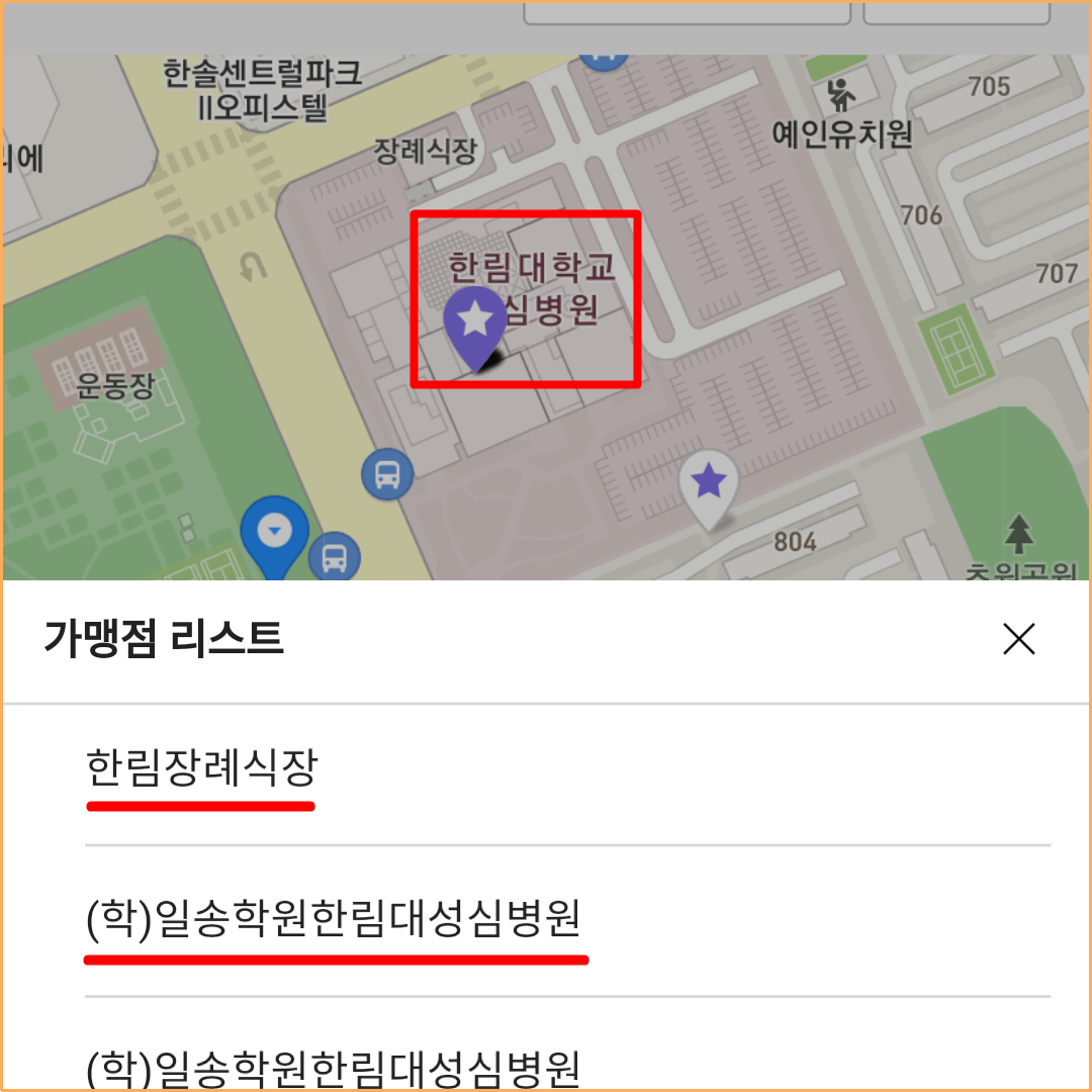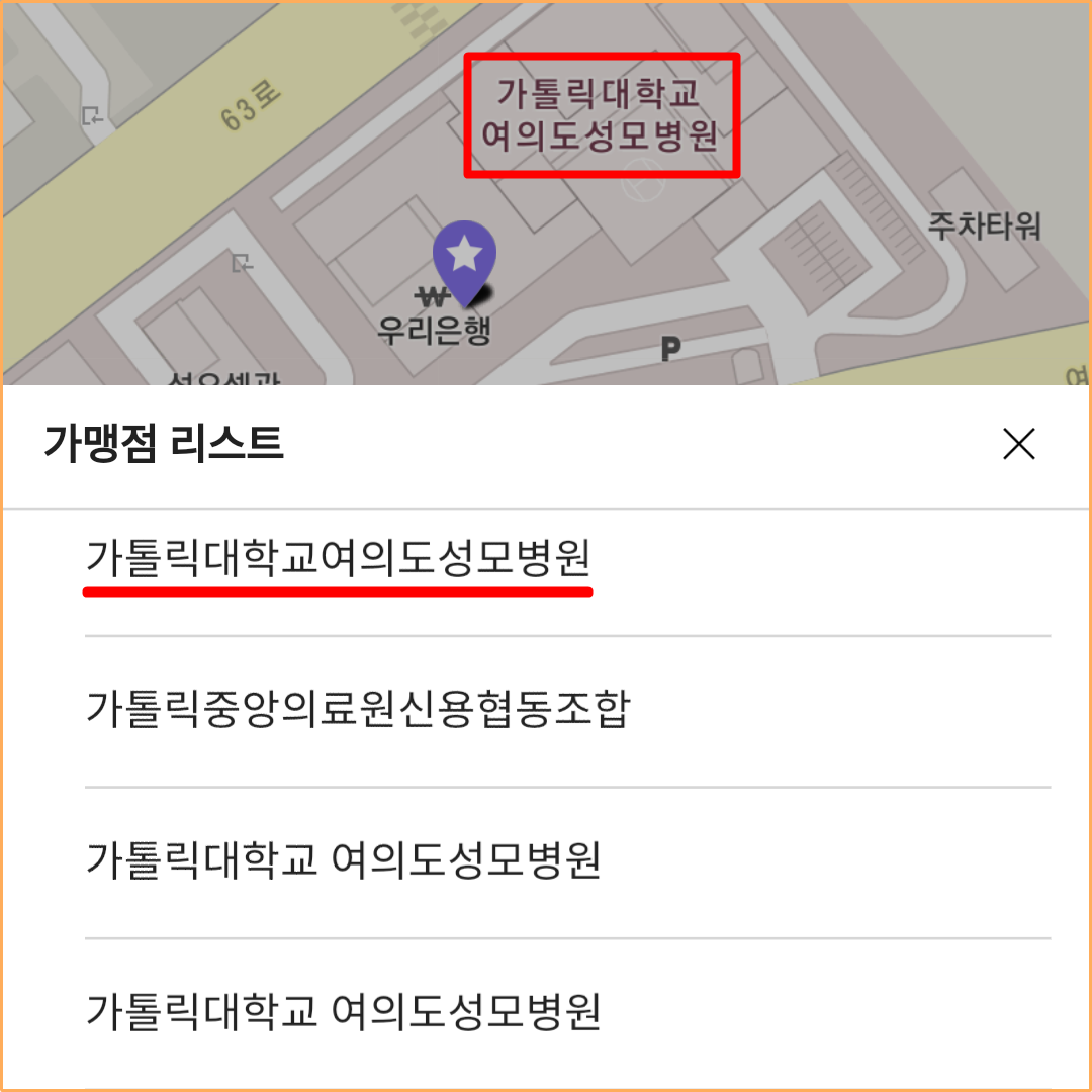 반포와 달리 여의도성모병원은 위 화면처럼 가맹점 리스트에 뜨는 거예요.