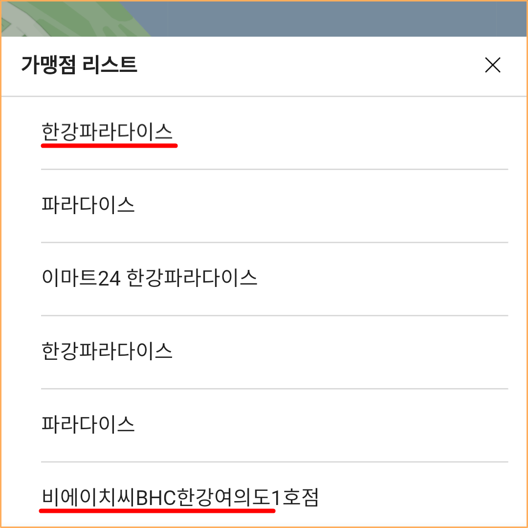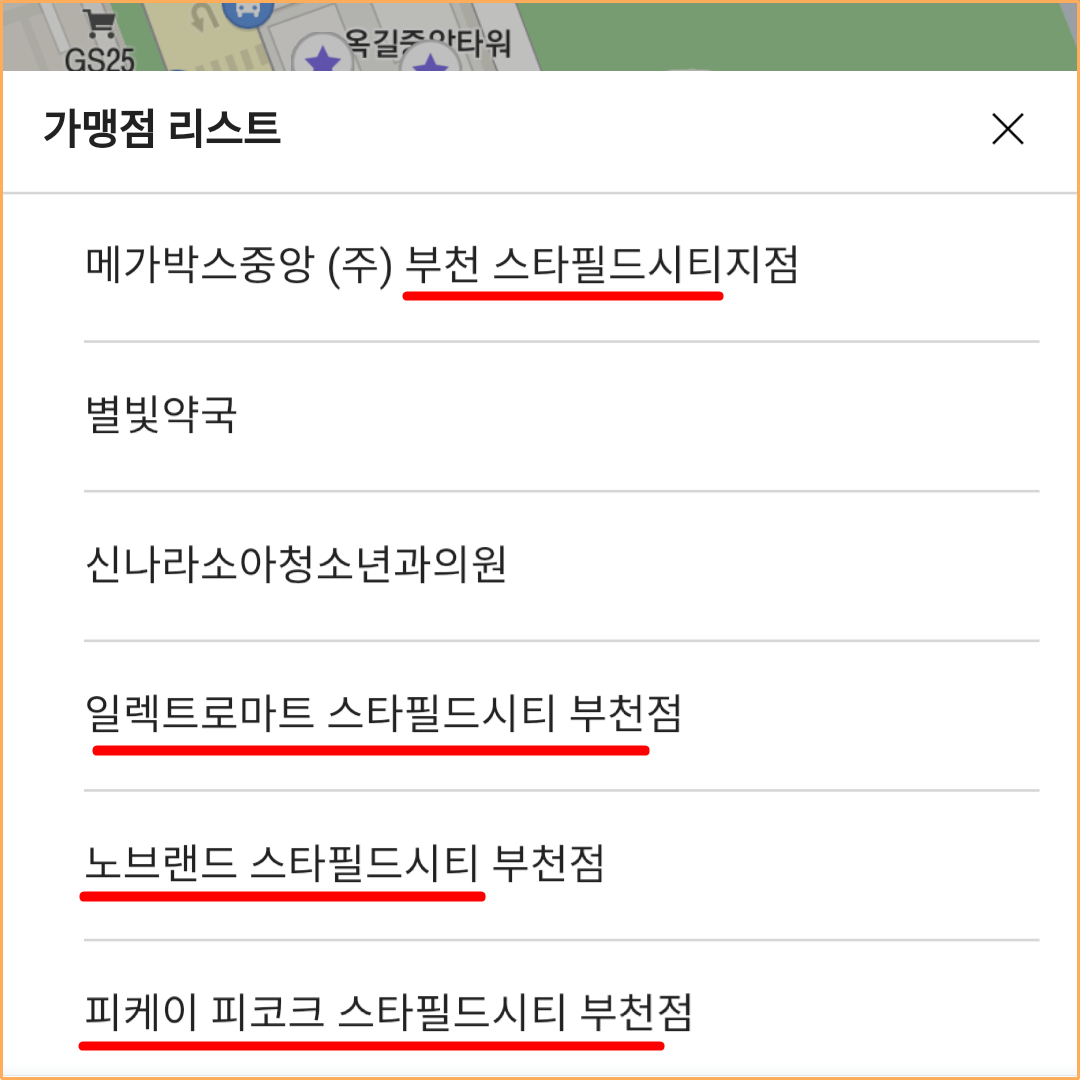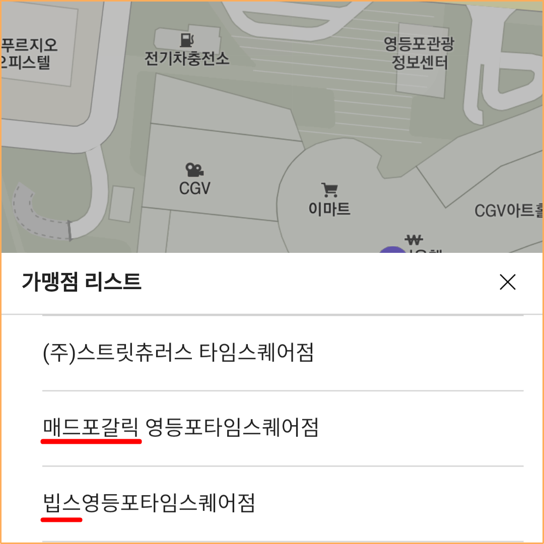 반포와 달리 여의도성모병원은 위 화면처럼 가맹점 리스트에 뜨는 거예요.