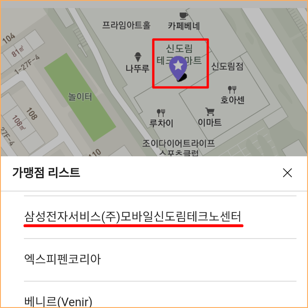 삼성전자서비스 모바일신도림테크노센터가 뜨는데요. 전자제품 구입이라기보다는 AS 및 휴대폰 수리를 하는 곳이 아닐까 싶어요.