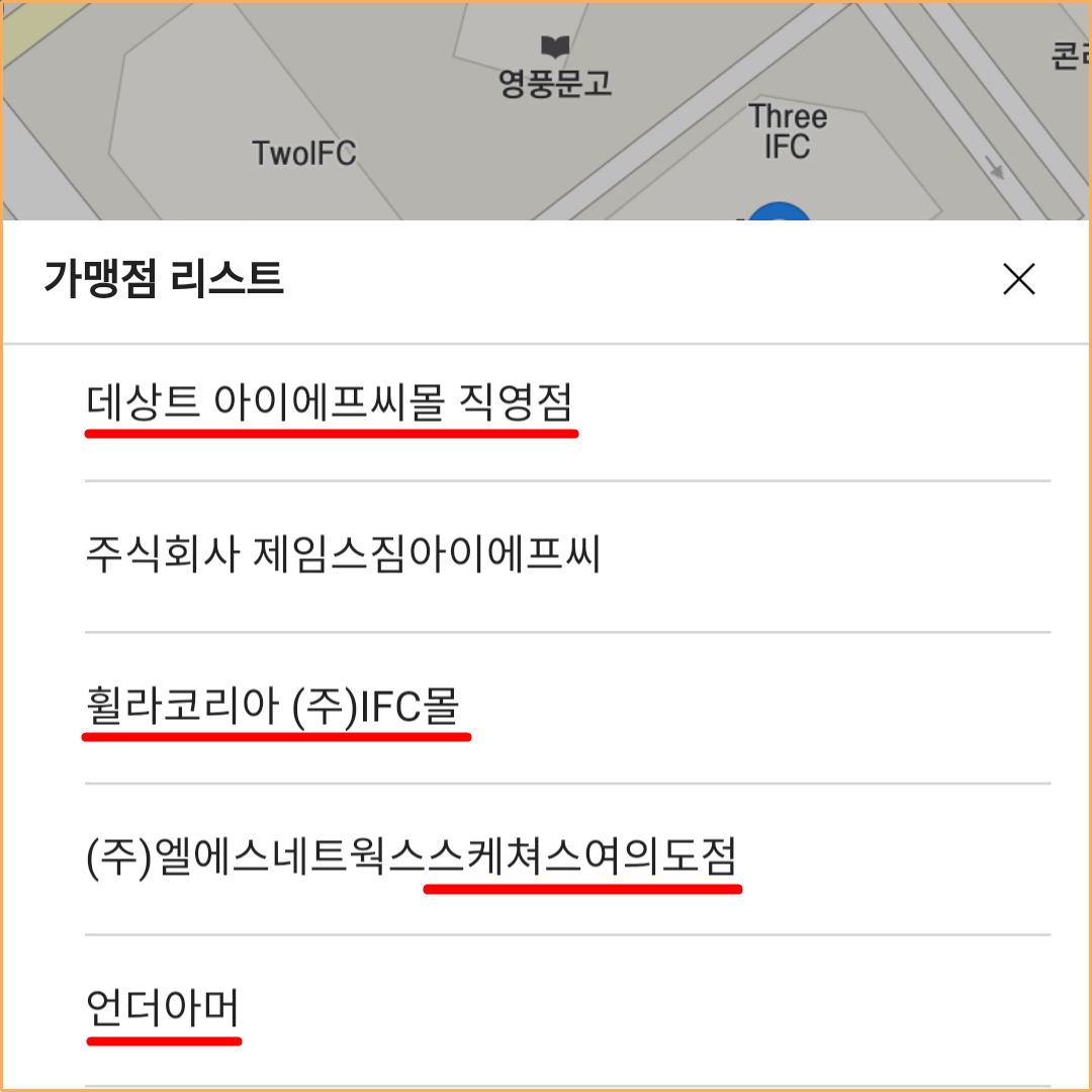 여의도에 위치한 IFC몰에서 재난지원금 가맹점을 찾아 봤어요.