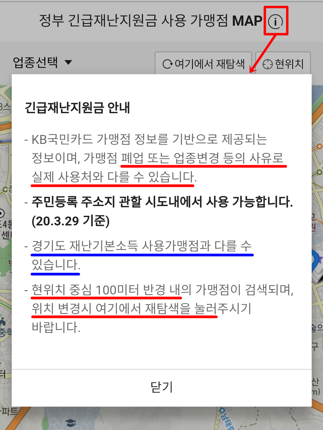 위치정보 동의를 누르면 위와 같이, '긴급재난지원금 안내'창이 떠요. 일단 '닫기'를 눌러 주세요.