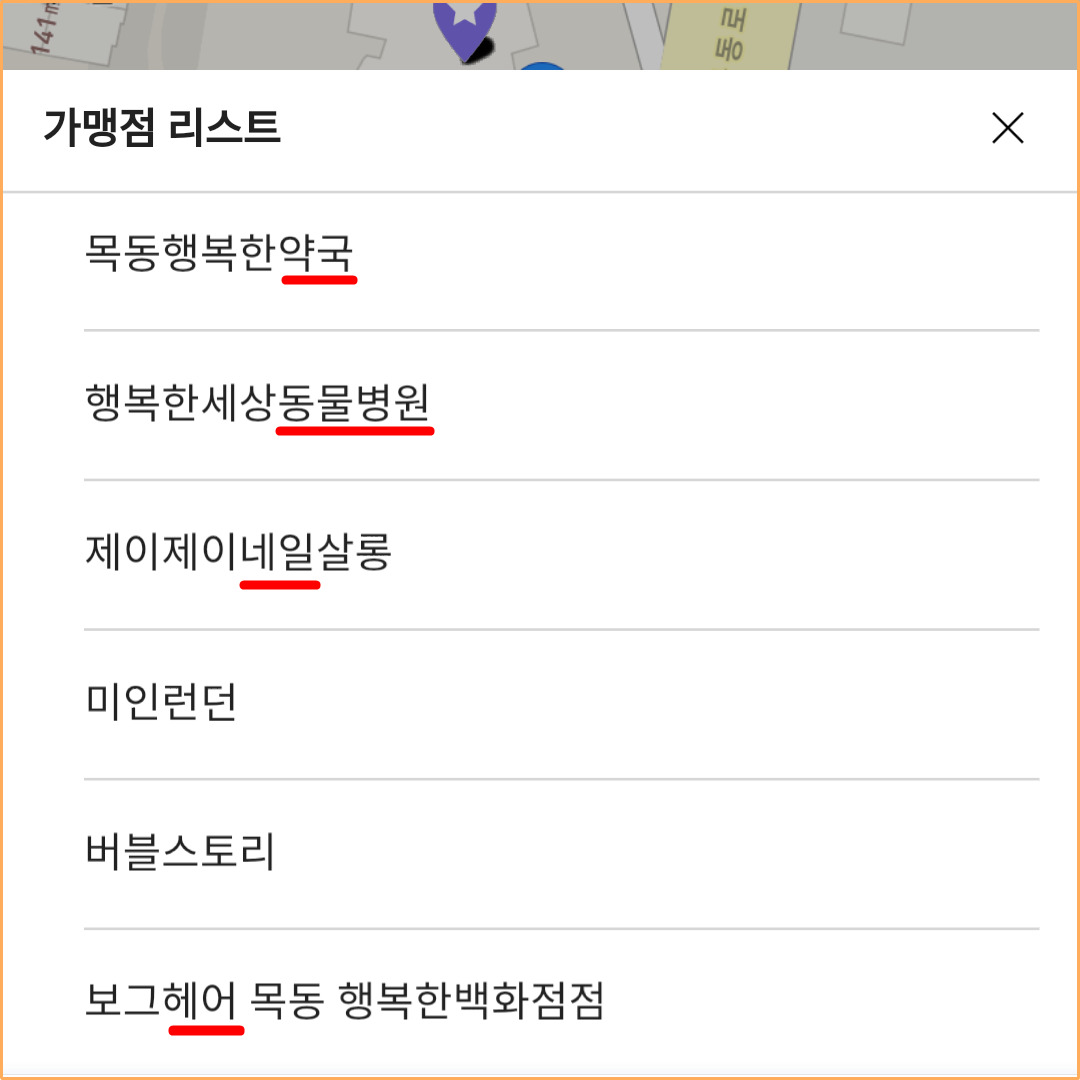 약국도 있고, 동물병원, 네일샵, 헤어샵도 가맹점으로 등록돼 있어요.