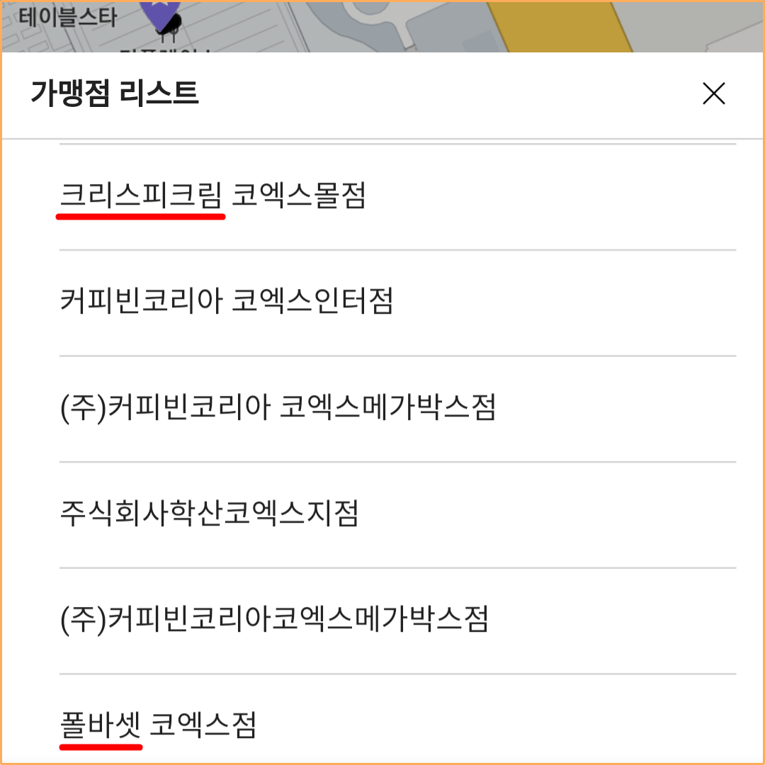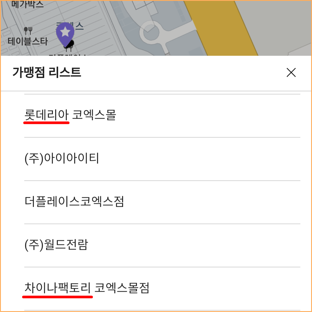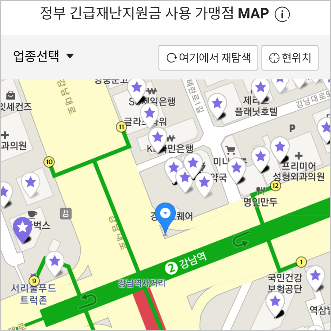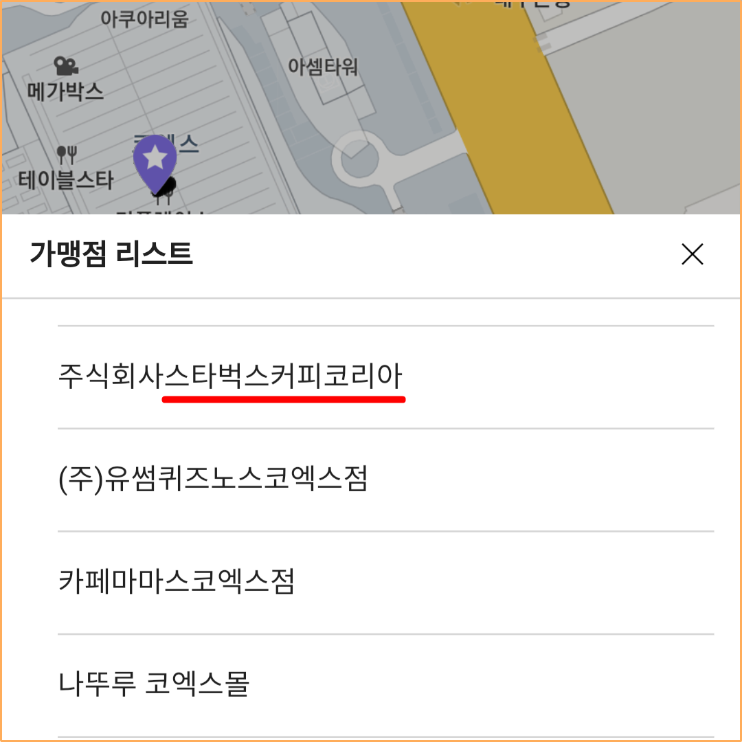 마지막으로 코엑스몰 안을 뒤져 봤는데요. 거기는 스타벅스가 재난지원금 사용처로 나오더라고요.