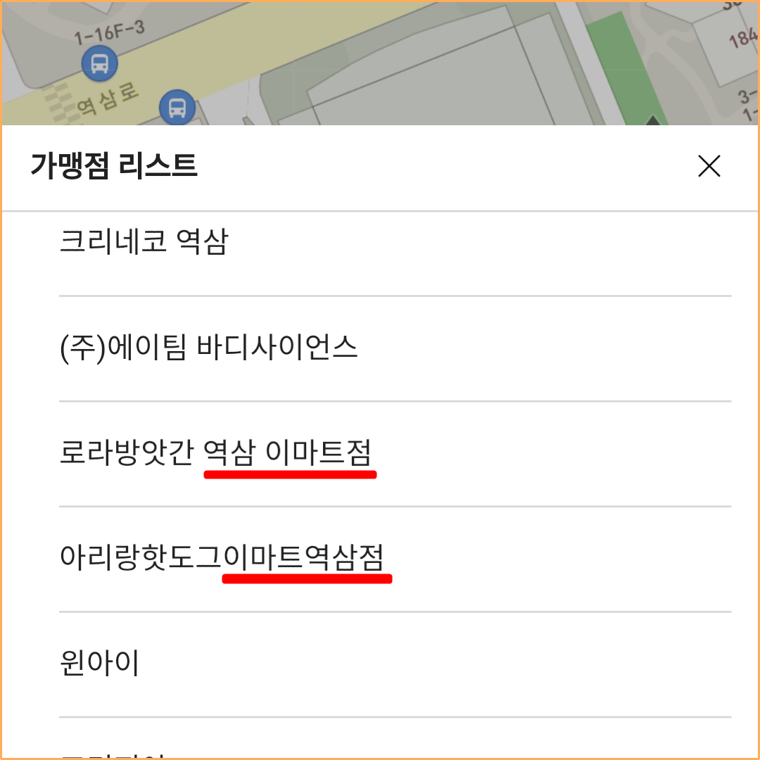 보시는 것처럼 역삼 이마트에도 로라방앗간이라는 떡볶이 분식점과 아리랑핫도그 등이 가맹점으로 나오죠?