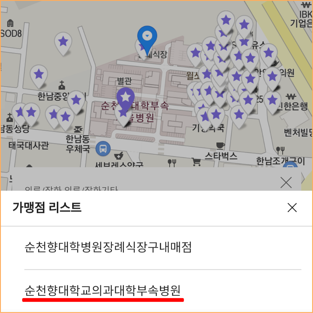 한남동에 있는 순천향대학교병원도 조회되네요. 장례식장 구내매점에서도 재난지원금을 쓸 수 있고요.