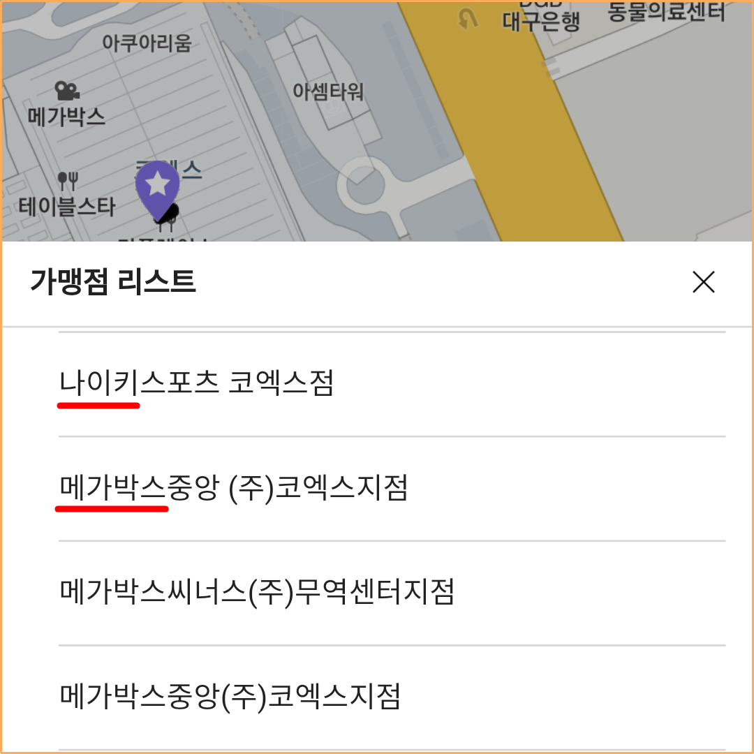나이키 스포츠용품점과 메가박스 영화관도 가맹점 리스트에 있어요.