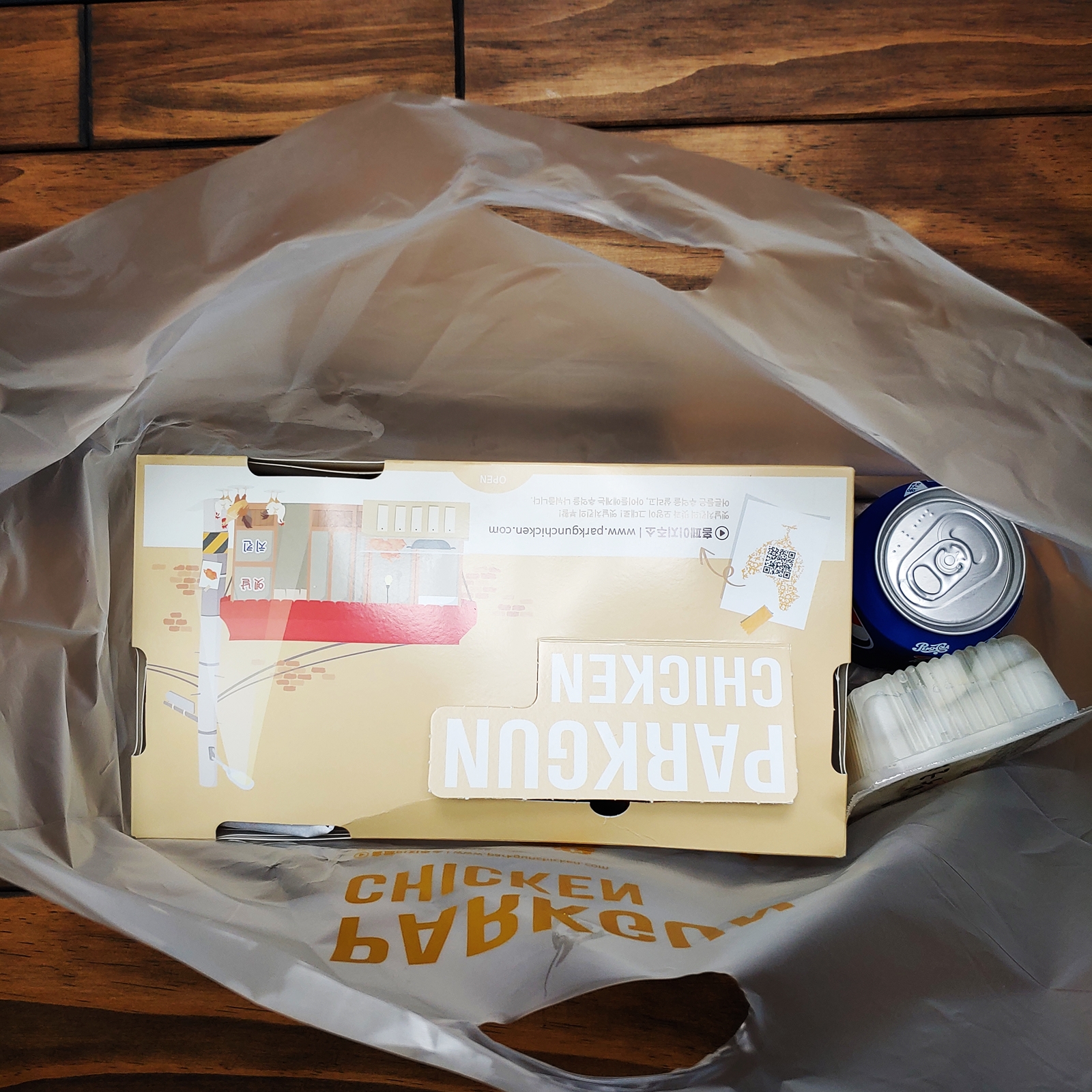 치킨상자와 캔콜라, 치킨무가 들어 있었고요.